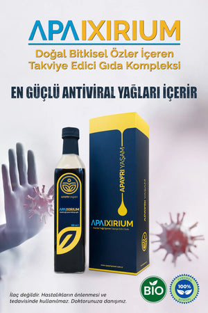 Apaixirium, tamamen doğal ve bitkisel özlerden oluşan, güçlü antiviral yağlar içeren, bağışıklık sistemini desteklemeye yönelik özel bir formüldür. %100 bitkisel içeriği sayesinde doğadan gelen en güçlü bileşenleri vücudunuza sunar. Apaixirium, hardal yağı başta olmak üzere zencefil, çörek otu, kekik gibi en değerli bitkisel yağlarla zenginleştirilmiştir.