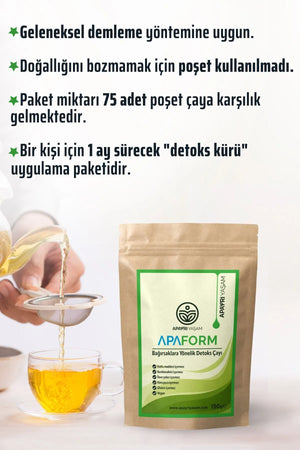 Apaform, geleneksel bitki karışımlarıyla formüle edilmiş tamamen doğal bir detoks çayıdır. Bu özel karışım, vücudun doğal dengesini korumaya yardımcı olurken, sindirim sistemini destekleyen bitki özlerinden oluşur. İçeriğindeki bitkiler sayesinde doğal bir arınma sağlar.