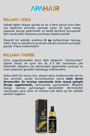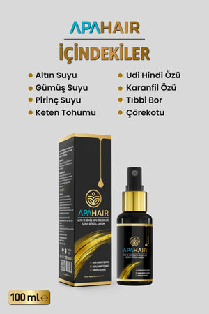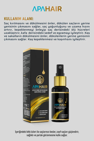 Altın ve gümüş suyu gibi değerli bileşenlerle formüle edilen Apahair, saçlarınızı güçlendirmeye, beslemeye ve sağlıklı bir görünüm kazandırmaya yönelik özel bir bitkisel karışımdır. Saçınıza doğal bir bakım sunarken, içeriğindeki bitki özleri saç derinizin ihtiyaç duyduğu özeni sağlar.